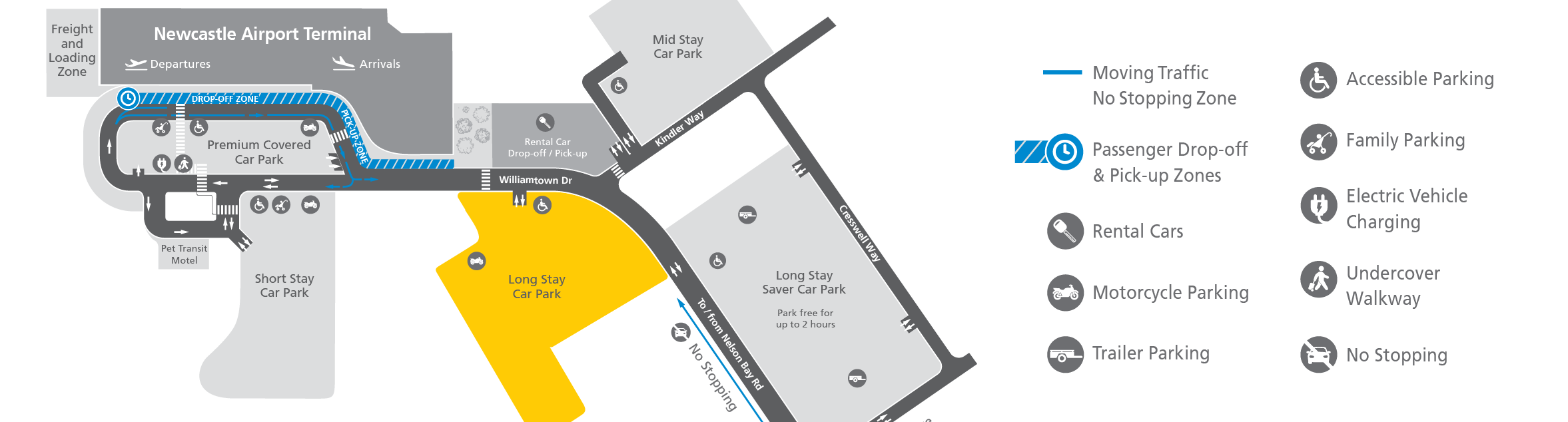 Just follow the airport signs along Nelson Bay Road, turn off onto Williamtown Drive, follow Williamtown Drive (800m), then turn left into the Long Stay 1 car park.