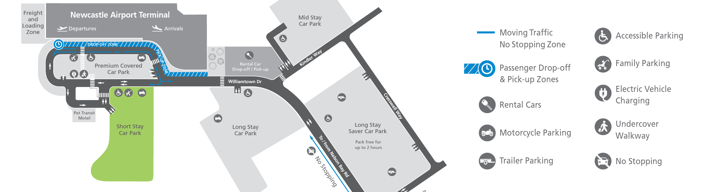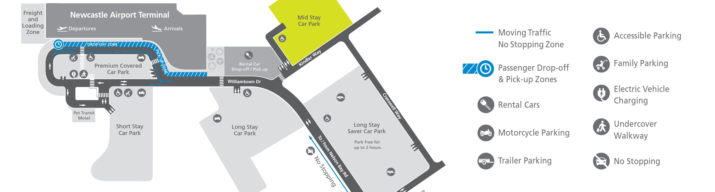 Parking for mobility impaired drivers is provided within all public car parks at Newcastle Airport. Spaces are signed and located as close to the terminal as possible. Vehicles must display a registered disabled parking sticker to use these bays.